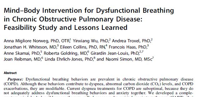 1. Norweg, A.M., et al., Mind–Body Intervention for Dysfunctional Breathing in Chronic Obstructive Pulmonary Disease: Feasibility Study and Lessons Learned. Journal of Integrative and Complementary Medicine, 2023.